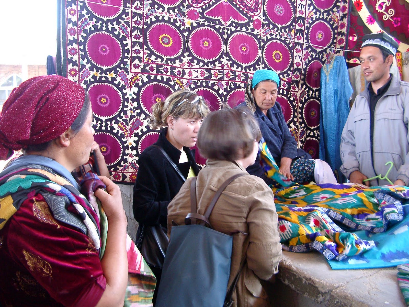 Ce qui pour moi caractérise cette population c'est surtout la tradition des ikats. En soie et coton ce sont des adras, en satin de soie ce sont des Atlas, quant aux Suzanis il s'agit de broderies réalisées à la main au point de chainettes sur des supports de soie ou de coton, avec des motifs traditionnels comme les tulipes, les œillets, les grenades. Le costume national féminin, robe en atlas, est largement porté par les femmes au quotidien.